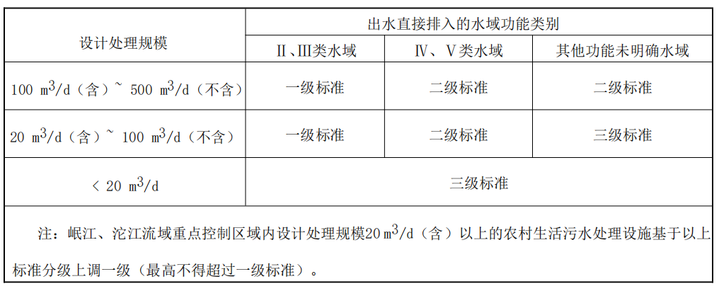 b) 根據污水處理設施出水直接排入的水域功能類別和設計處理規模,將農村生活污水處理設施水污染物排放標準劃分為一級標準、二級標準和三級標準,各級標準的適用情況見表 1。其中, 岷江、沱江流域重點控制區域內(參見附錄A),設計處理規模 20 m3/d(含)以上的農村生活污水處理設施對應表 1 所列標準上調一級(最高不得超過一級標準);