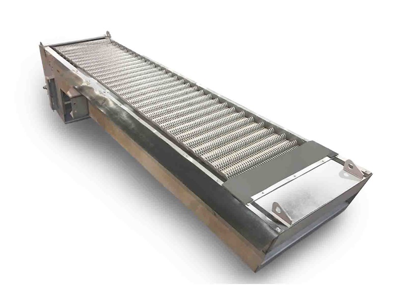 耙齒鏈運轉到設備的上部時,由于槽輪和彎軌的導向,使每組耙齒之間產生相對自清運動,絕大部分固體物質靠重力落下。另一部分則依靠清掃器的反向運動把粘在耙齒上的雜物清掃干凈;