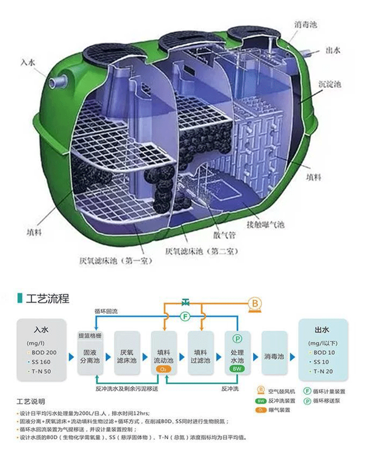3 四川凈化槽生化池采用生物接觸氧化法,其填料的體積負荷比較低,微生物處于自身氧化階段,產泥量少,僅需三個月(90天)以上排一次泥(用糞車抽吸或脫水成泥餅外運)。